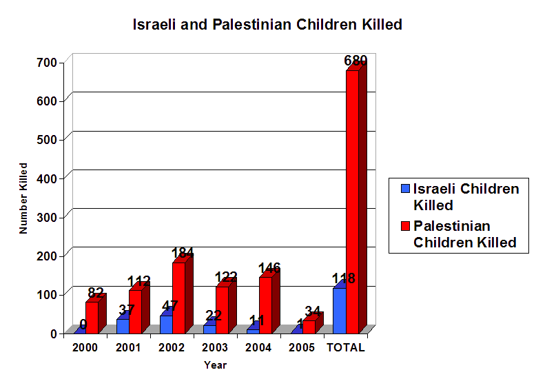 dargestellt ![]() Dem steht zum Beispiel folgende Berichterstattung gegenüber. Leider waren keine Presseanalysedaten aus Europa verfügbar, deshalb ist hier beispielhaft die Berichterstattung des San Francisco Chronicle für die Periode von 29 September 2000 bis 31 März 2001 über getötete Kinder aus Israel und Palästina dargestellt. Bis zum Beweis des Gegenteils behaupte ich, dass ich von den europäischen Medien den selben Eindruck habe. |